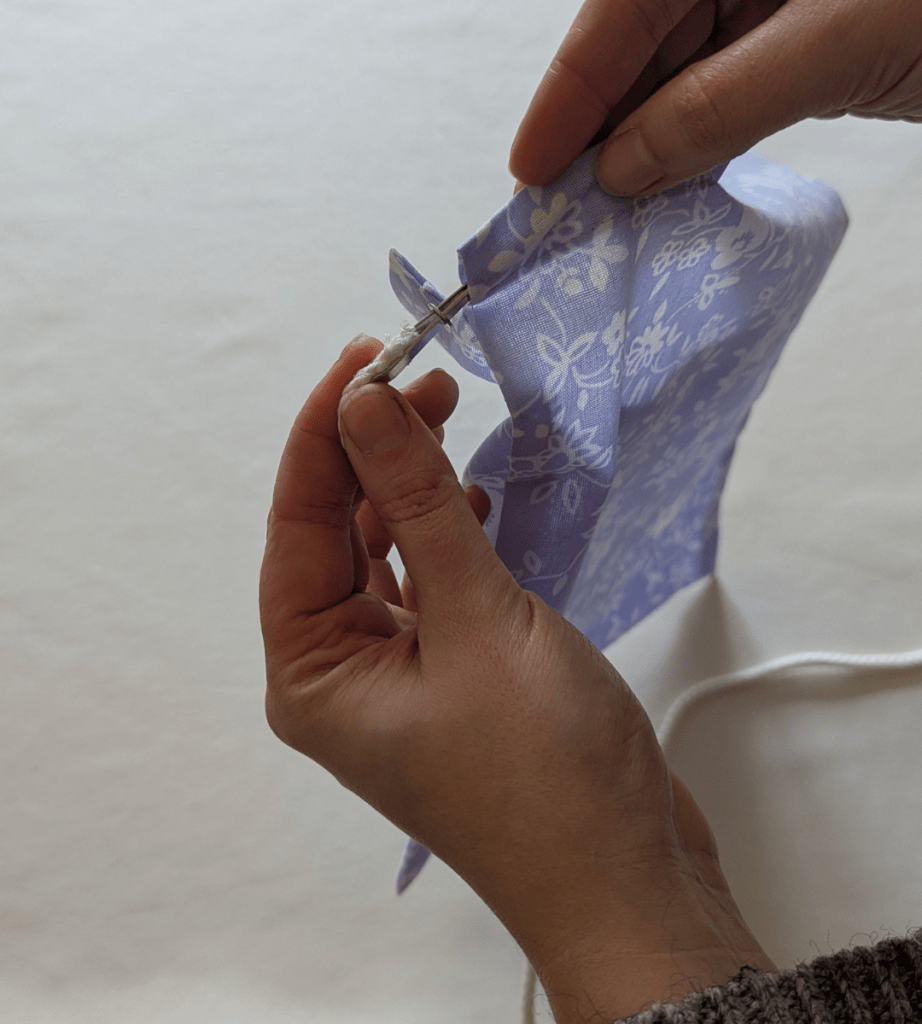 A l’aide d’une épingle à nourrice ou d’un enfileur, passer un premier cordon dans une des glissières et faites le ressortir par l’autre glissière. Faire un nœud pour bloquer le cordon.