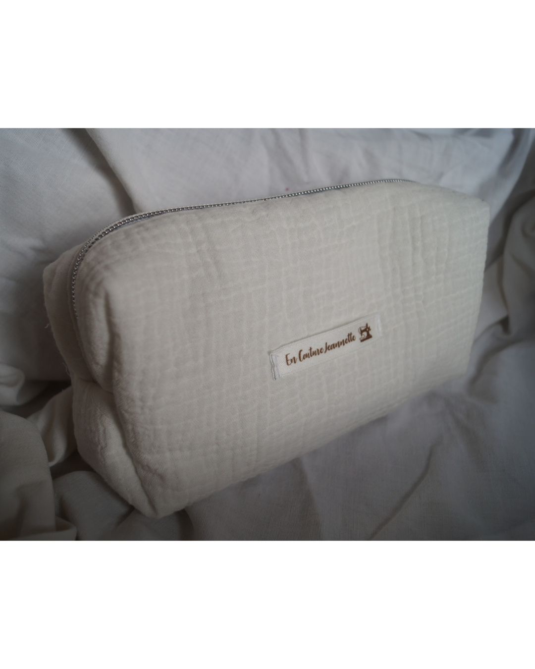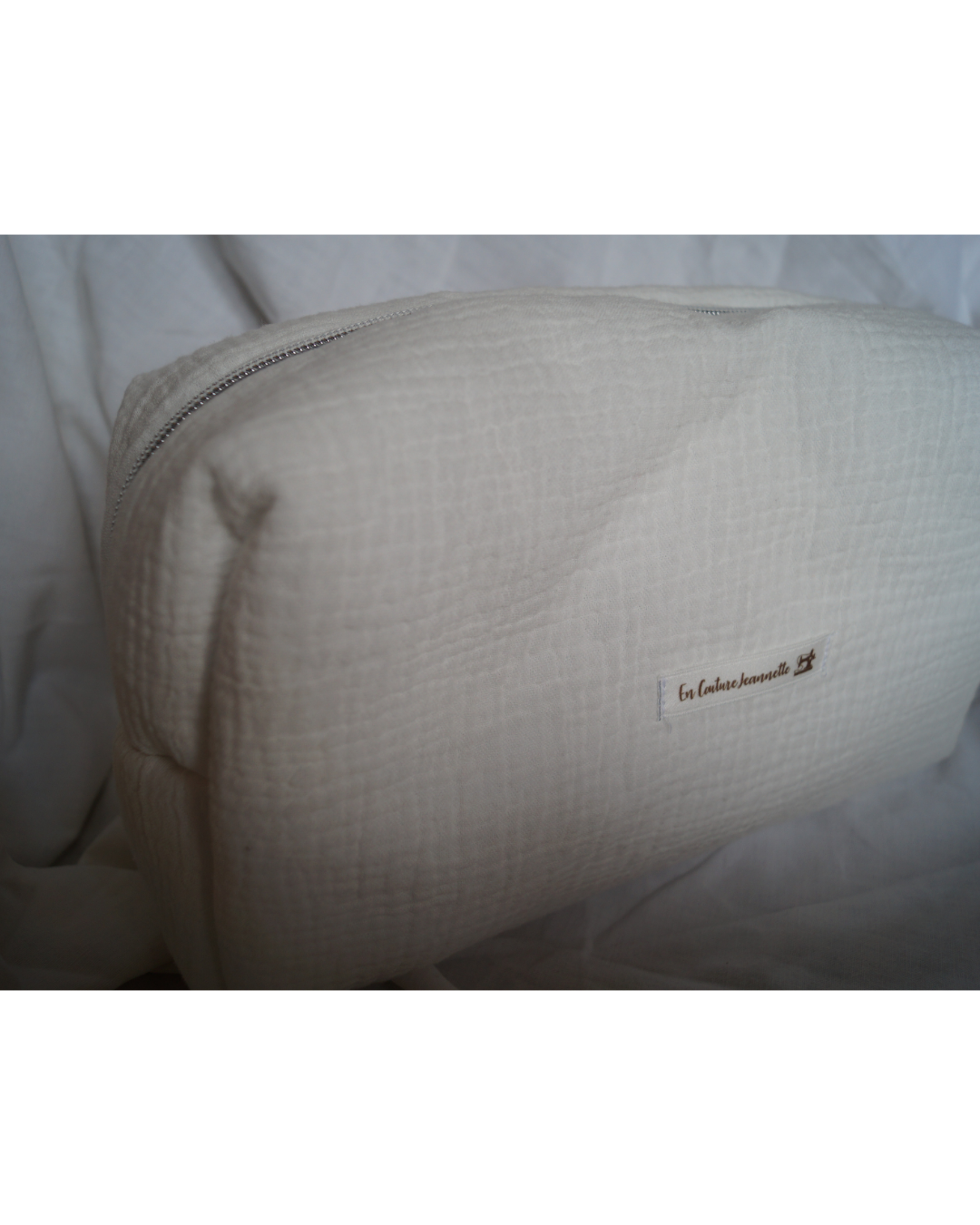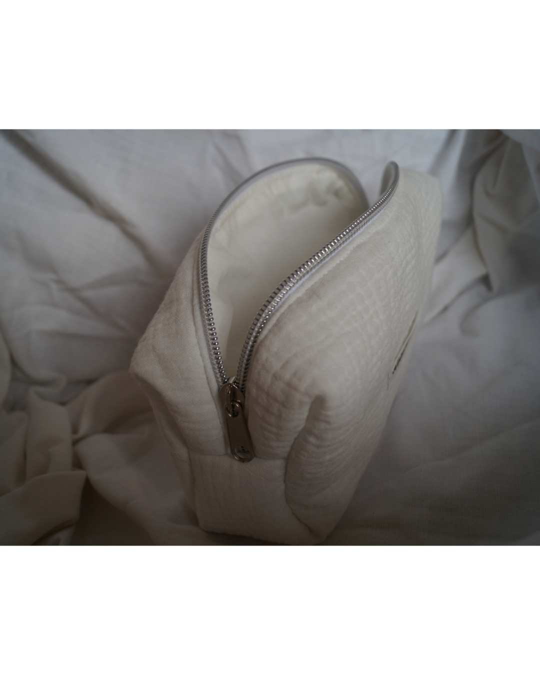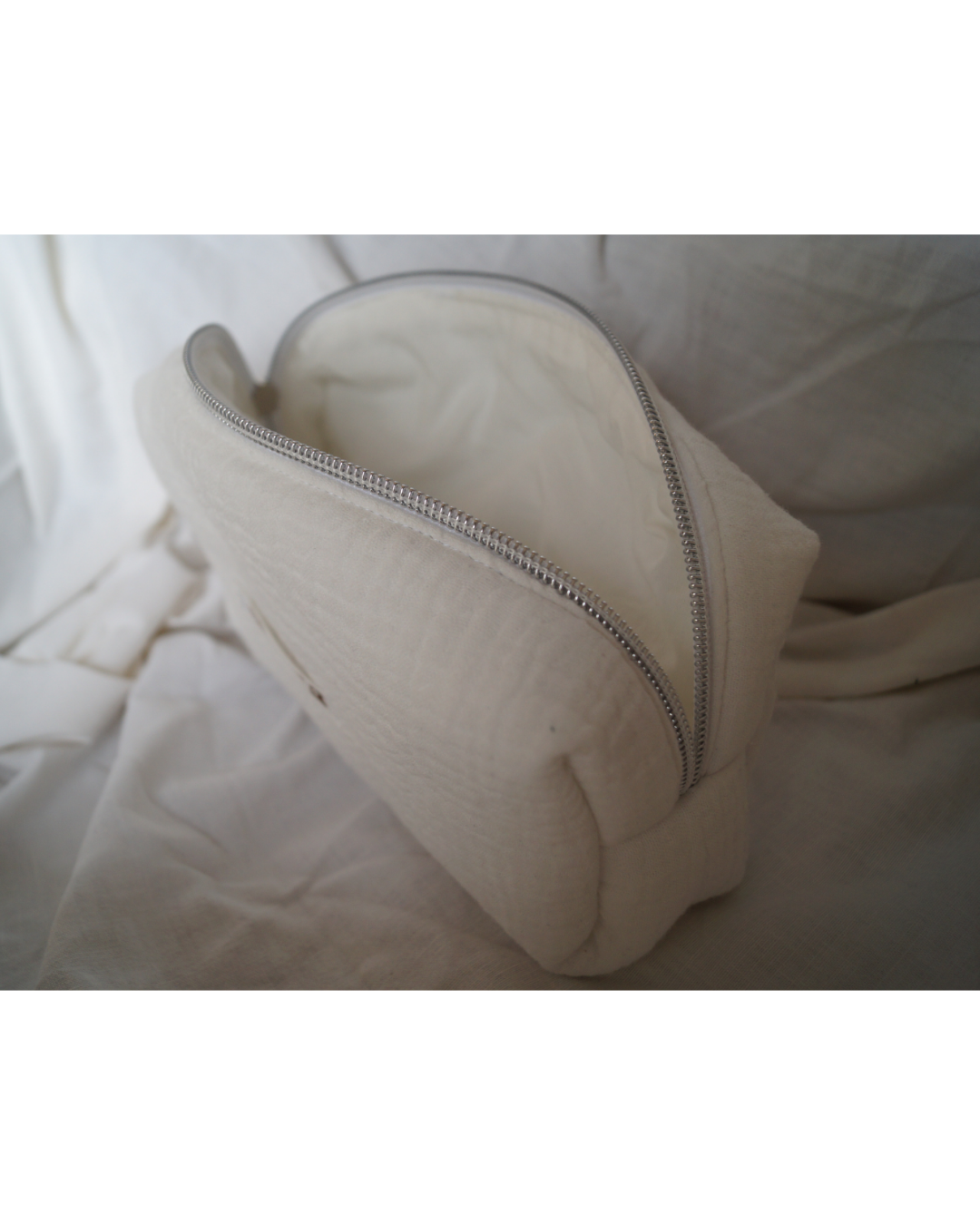 Son tissu en double gaze blanc cassé apporte un rendu naturel et élégant, facile à associer à tous les styles. Les trousses se ferment par une fermeture éclair pour garder vos affaires bien en place.